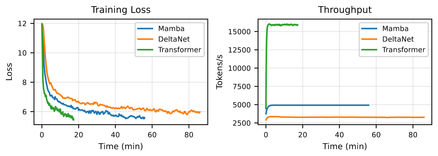 Custom implementation of the DeltaNet and Mamba SSM, comparing performance/throughput against a Transformer baseline, and testing distributed data parallel (DDP) schemes